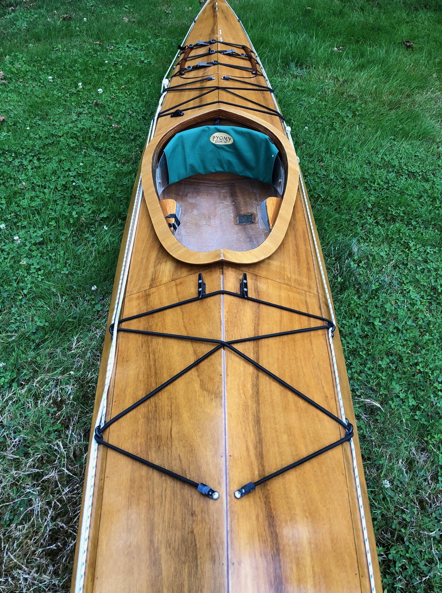 Glide effortlessly across the water in this stunning handmade 17.5 foot wooden Pygmy Coho kayak.